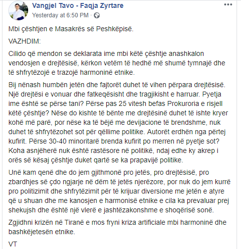 Unë kam qenë dhe do jem gjithmonë pro jetës, pro drejtësisë, pro zbardhjes së çdo ngjarje në dëm të jetës njerëzore, por nuk do jem kurrë pro politizimit dhe shfrytëzimit për të krijuar diversione me jetën e atyre që u shuan dhe me kanosjen e harmonisë etnike e cila ka prevaluar prej shekujsh dhe është një vlerë e jashtëzakonshme e shoqërisë sonë. Zgjidhni krizën në Tiranë e mos fryni kriza artificiale mbi harmoninë dhe bashkëjetesën etnike.