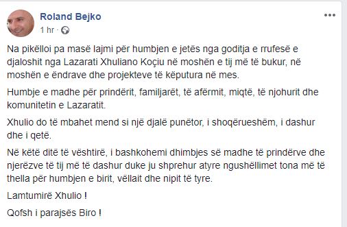 Kreu i PD Gjirokastër, Roland Bejko, ka bërë një mesazh ngushëllimi për 22-vjeçarinn Xhuljano Koçiu, i cili humbi jetën pasditen e sotme pas goditjes nga rrufeja. Bejko thotë se vdekja e Xhuljanos në moshën më të bukur është një humbje edhe për komunitetin e Lazaratit. Më poshstë mesazhi i tij i plotë.