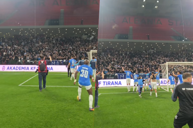 Në fund të sfidës, ashtu sicc ështe bërë e zakonshme, lojtarët e Tiranës kanë shkuar poshtë tribunës së ultrasve të tyre për të festuar.