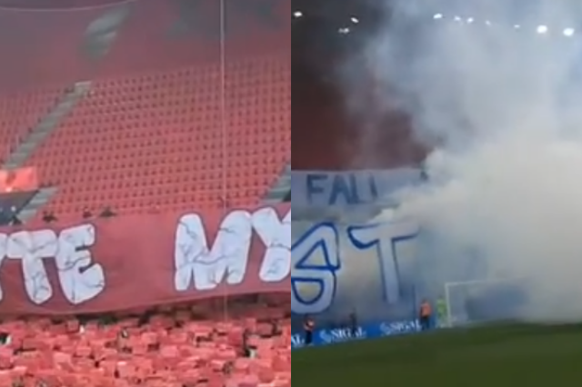 Por tifozët bardheblu iu janë përgjigjur me një tjetër banderolë: “Ata duan që ne të biem, por ne qëndrojmë mbi të gjithë”.