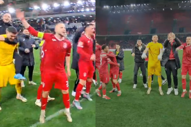 Pas vërshëllimës finale të arbitrit, lojtarët e të kuqve dhe tifozët “u bënë një”. Futbollistët e Partizanit festuan bashkë me mbështetësit e skuadrës, teksa nuk mungoi kërcimi dhe këngët. “Kush nuk kërcen është mi bashkie”, – dëgjohej ndër të tjera. Ky sukses bën që Partizani të afrohet edhe më shumë me zonën e Final Four.