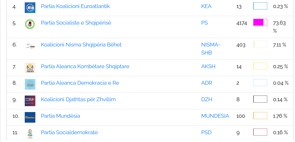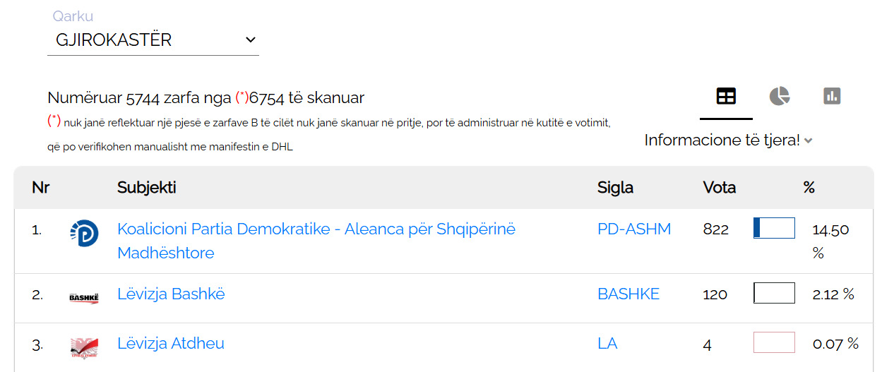 Numërimi i votave të diasporës po vijon. Për qarkun Gjirokastër kanë mbetur akoma edhe 1010 zarfe të mbërritura në KQZ nga 6754 zarfe në total. Dukshëm Partia Socialiste ka fituar shumicën e votave, me një rezultat 73.63%. Partia Demokratike nuk ka arritur të grumbullojë deri më tani as 1 mijë vota ndërsa Nisma Shqipëria Bëhet ka rreth 403 vota. Shihni tabelën më poshtë.