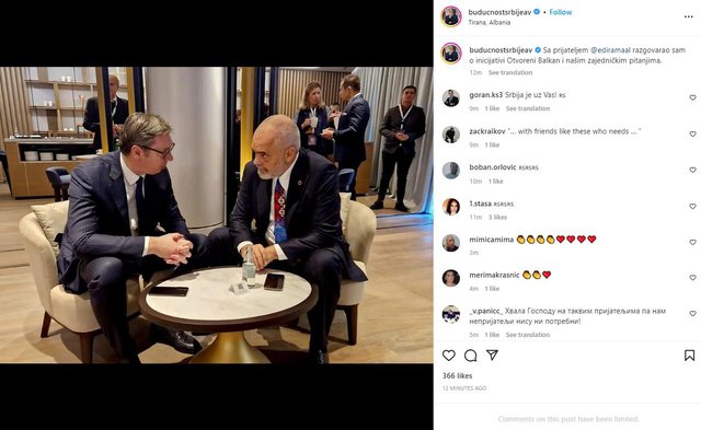 Presidenti serb, Aleksandër Vuçiç ka publikuar një foto në rrjetet sociale me kryeministrin Edi Rama në Tirana, ku po zhvillohen edhe punimet e samitit BE-Ballkani Perëndimor.