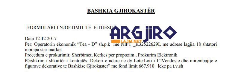 Tenderi i parë është fituar nga kompania ‘Tea- D’ Sh.p.k. Objekti ka qenë “Vendosje dhe mirembajtje e figurave dekorative te Bashkise Gjirokaster” me fond 801 492 lekë të reja me tvsh.