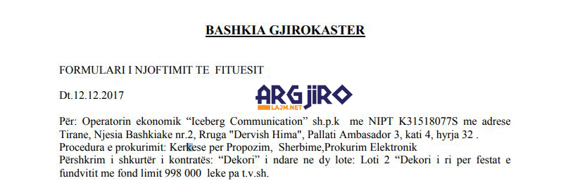 Tenderi i parë është fituar nga kompania ‘Tea- D’ Sh.p.k. Objekti ka qenë “Vendosje dhe mirembajtje e figurave dekorative te Bashkise Gjirokaster” me fond 801 492 lekë të reja me tvsh.