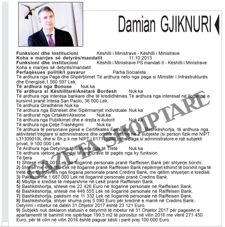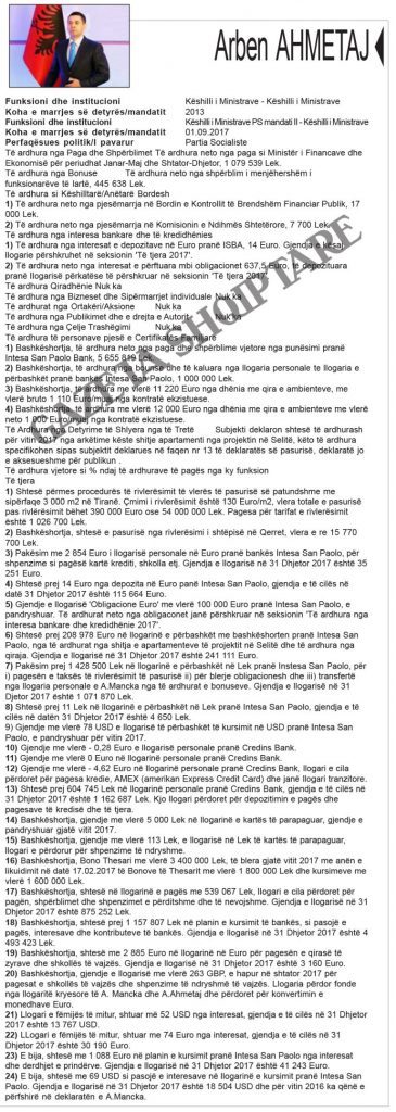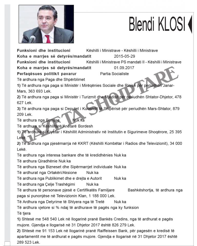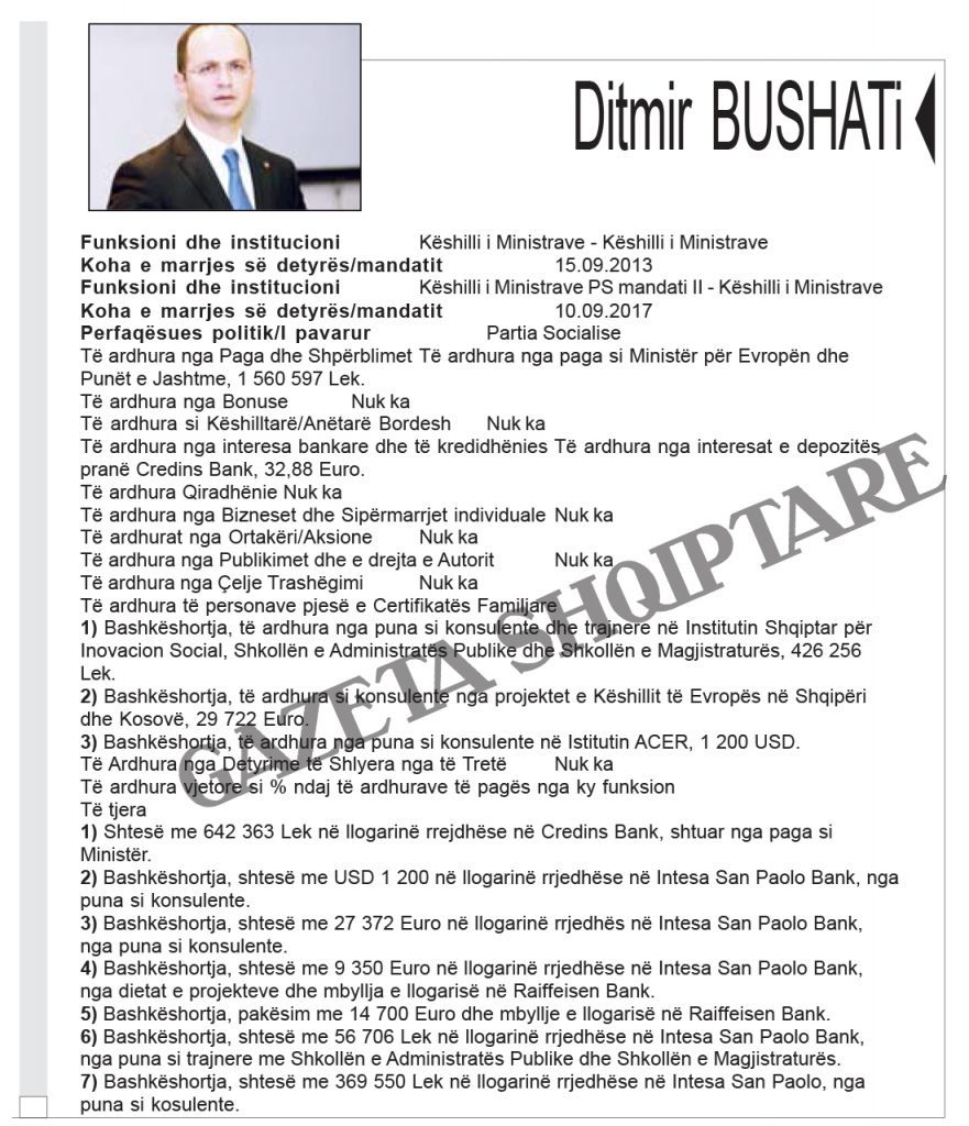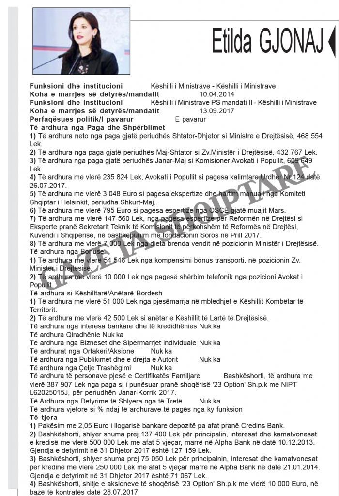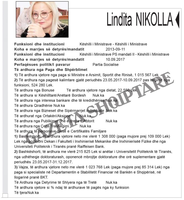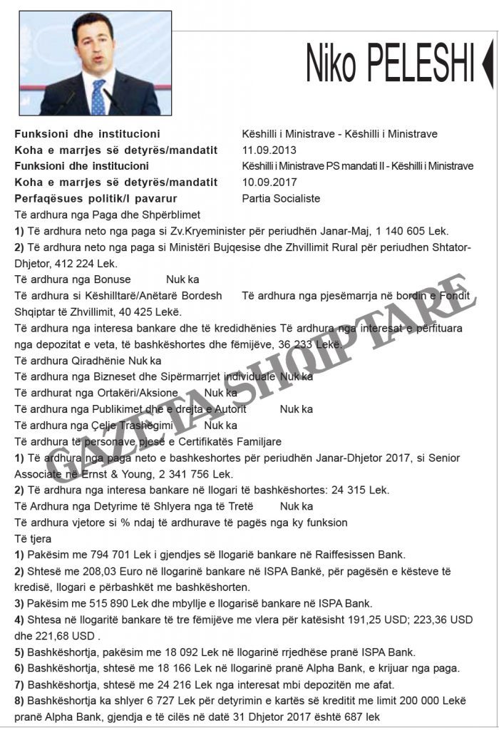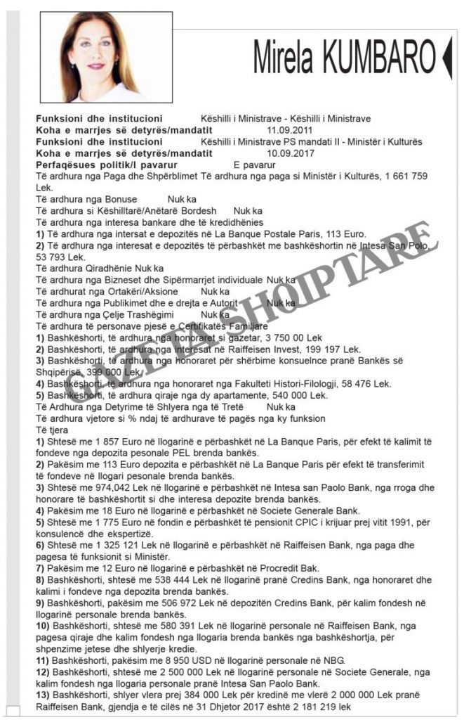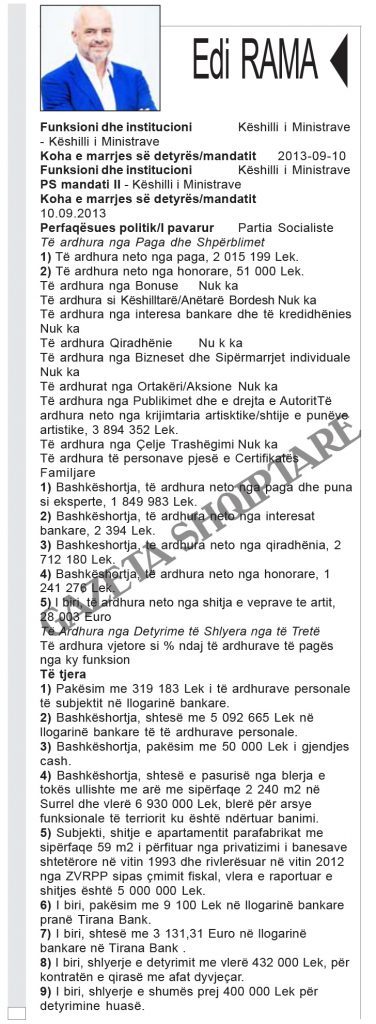 Zbardhen pasuritë e kabinetit “Rama 2”. Kryeministri Edi Rama ka deklaruar të ardhurat nga rroga, nga honoraret dhe fitimet nga shitja e pikturave. Zëvendëskryeministra Senida Mesi dhe bashkëshorti i saj disponojnë 14 llogari bankare, dy apartamente dhe automjet. Bashkëshorti zëvendëskryeministres zotëron 100% të aksioneve të një kompanie.