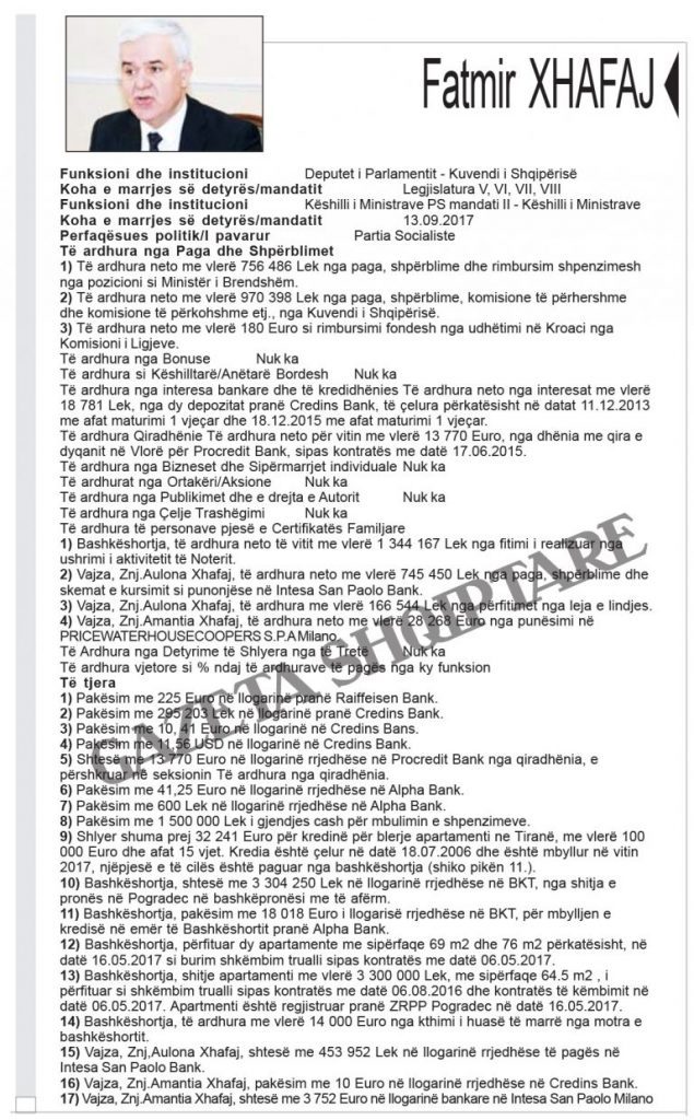 Ministri i Brendshëm deklaron si të ardhura vjetore pagën dhe të ardhurat nga komisionet e përhershme e të përkohshme në Kuvend. Fatmir Xhafaj ka deklaruar si pasuri të patundshme një dyqan në Vlorë nga dhënia me qira e të cilit ka marrë 13770 euro në një vit. “Gazeta Shqiptare” publikon pasuritë e kabinetit qeveritar, të cilat u referohen deklaratave të pasurisë, dorëzuar prej tyre në Inspktoratin e Lartë të Deklarimit dhe Kontrollit të Pasurive, të cilat janë zbardhur nga “Open Spending Albania”.
