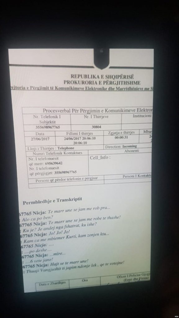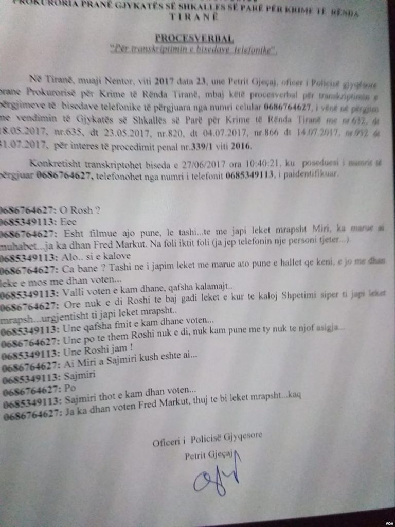 “…Nga përgjimet e telefonave celularë në përdorim të shtetasit Gjevi Ndoka evidentohet se ky shtetas në bashkëpunim me persona të tjerë, si para dhe gjatë fushatës zgjedhore është përfshirë në mënyrë aktive duke ofruar dhe dhënë të holla (para) zgjedhësve për të votuar kandidatët për deputetë nën siglën e Partisë Socialiste, të dhëna këto që dalin nga përgjimet,” shkruhet në dosjen hetimore.