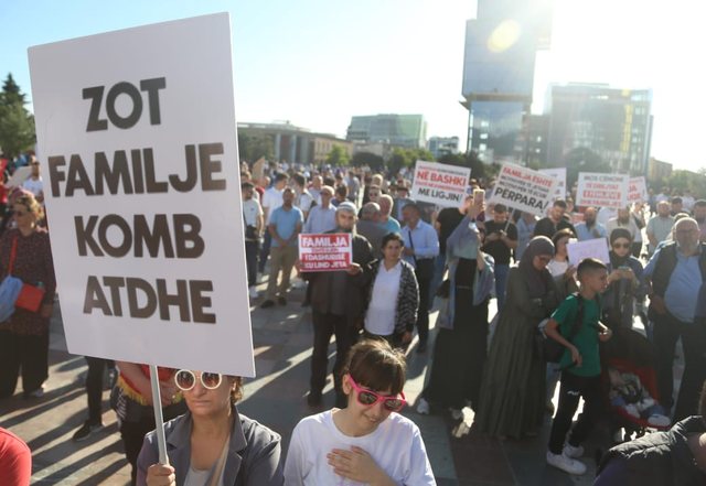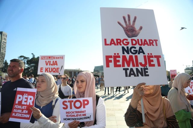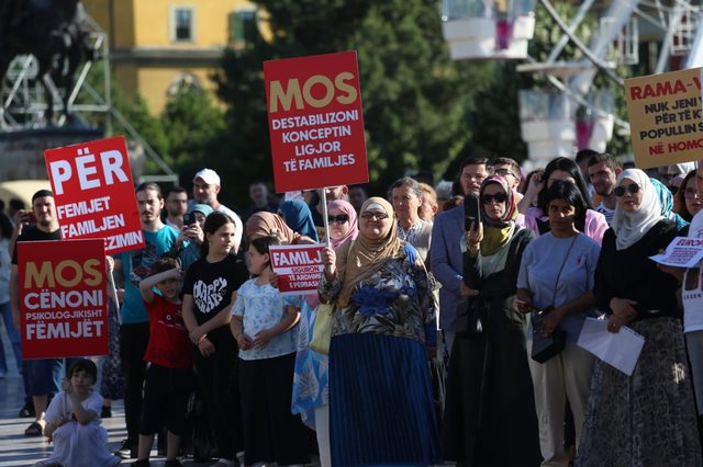 “Mos destabilizoni konceptin ligjor të familjes”, “Mos cenoni psikologjikisht fëmijët”, “Familja siguron të ardhmen e përbashkët”, shkruhet në disa nga pankartat.